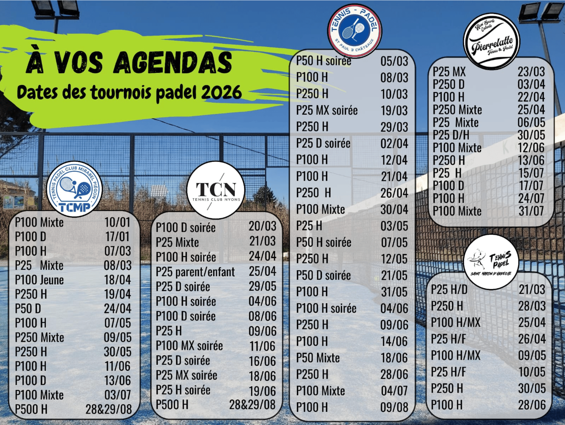 Veuillez trouver ci-dessous le calendrier des tournois padel du territoire provençale de février à Aout 2026.